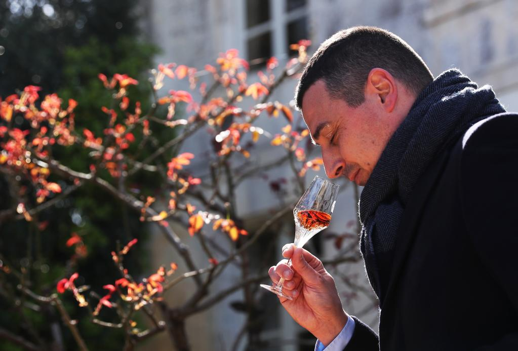 A man tastes a glass of Cognac at Remy Martin house in Cognac, southwestern France, March 23, 2022. Cognac/eau-de-vie de cognac/eau-de-vie des charentes is listed in the China-EU agreement on geographical indications. (Xinhua/Gao Jing)