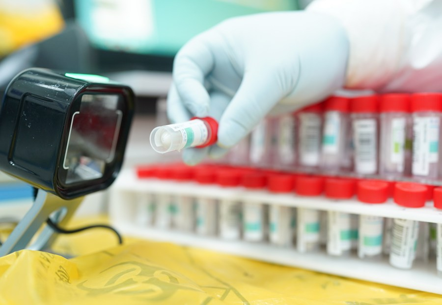A staff member works at a COVID-19 nucleic acid testing laboratory in east China's Shanghai, March 23, 2022. (Xinhua/Ding Ting)