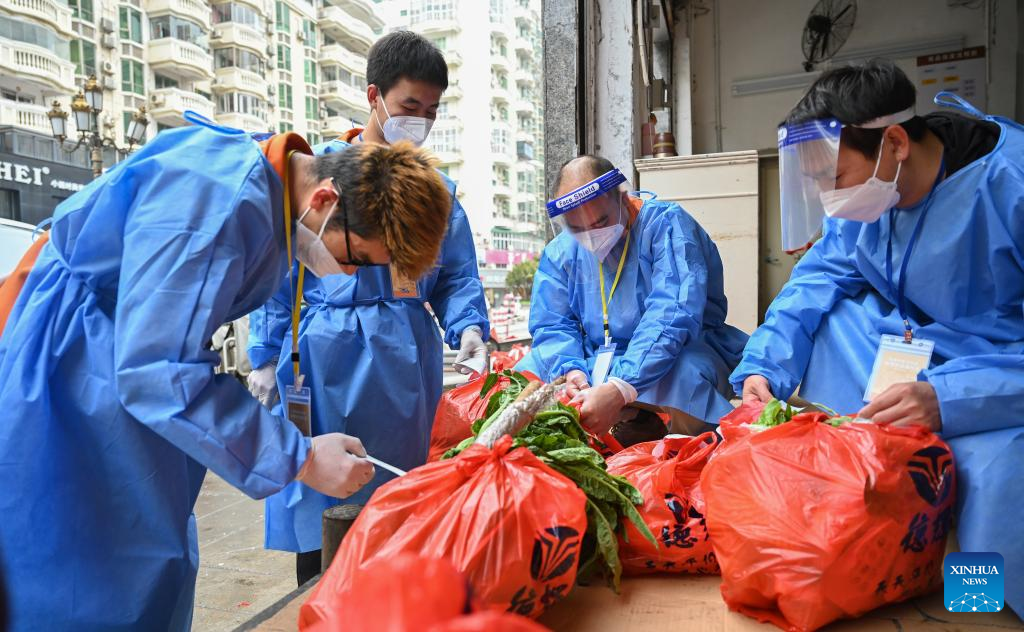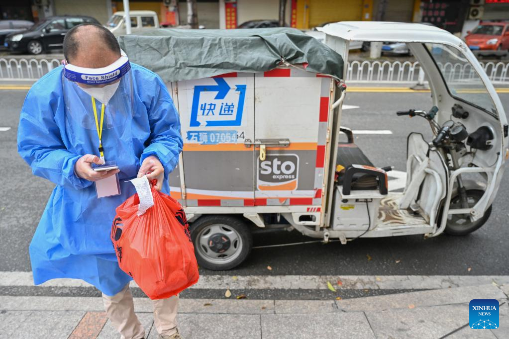 A courier delivers daily necessities for residents in Quanzhou, southeast China's Fujian Province, March 26, 2022. More than 100 local express delivery couriers have volunteered to deliver goods for residents amid the recent COVID-19 resurgence in Quanzhou. (Photo by Zhou Yi/Xinhua)