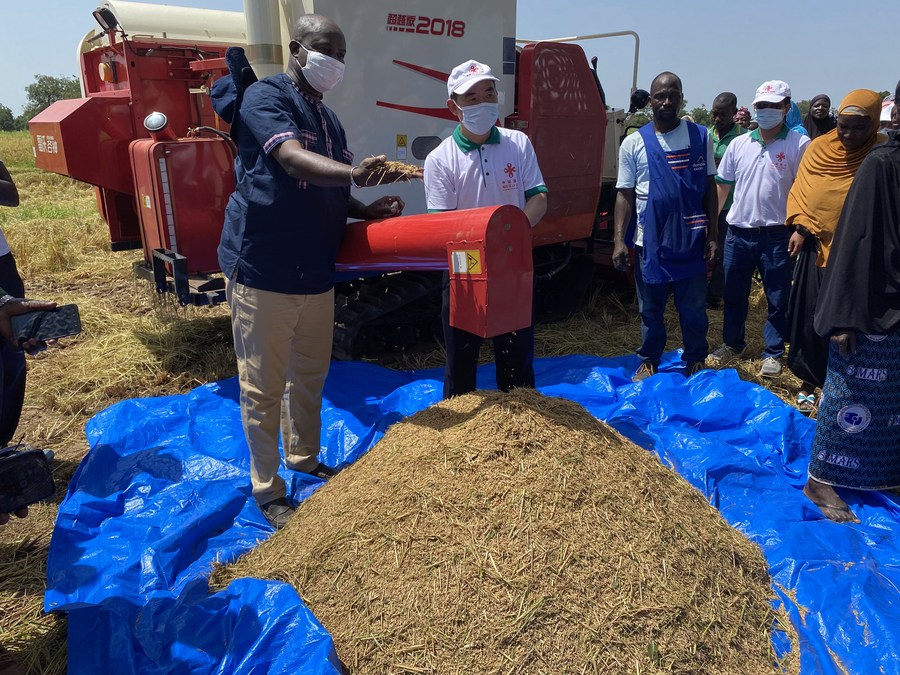 Chinese experts help locals in mechanized harvesting of rice in the demonstration area of Nariou village in Burkina Faso, Oct. 8, 2021. (Xinhua)
