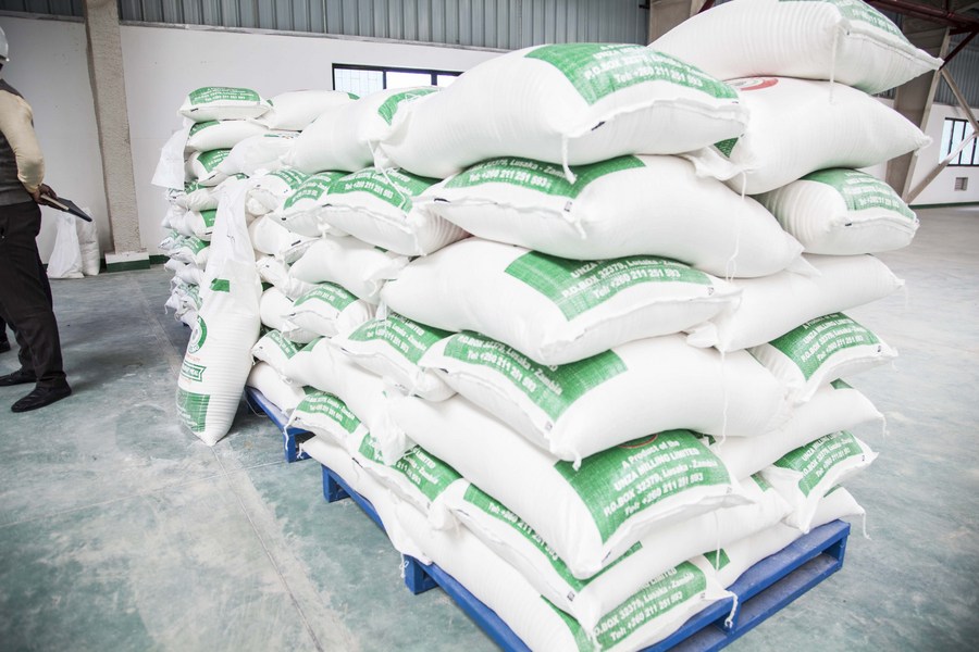 Photo shows products made by a China-aid milling plant in Lusaka, Zambia, on March 9, 2022. (Photo by Martin Mbangweta/Xinhua)