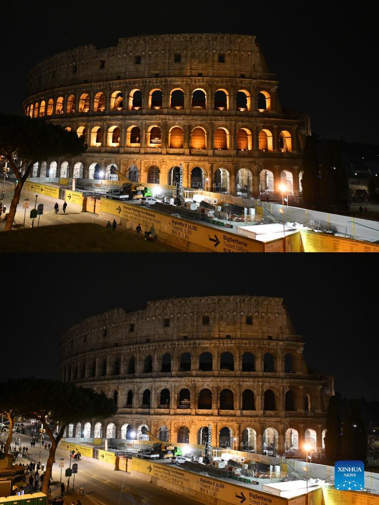 Combo photo shows the Colosseo before (top) and during the Earth Hour in Rome, Italy, on March 26, 2022. (Xinhua/Jin Mamengni)