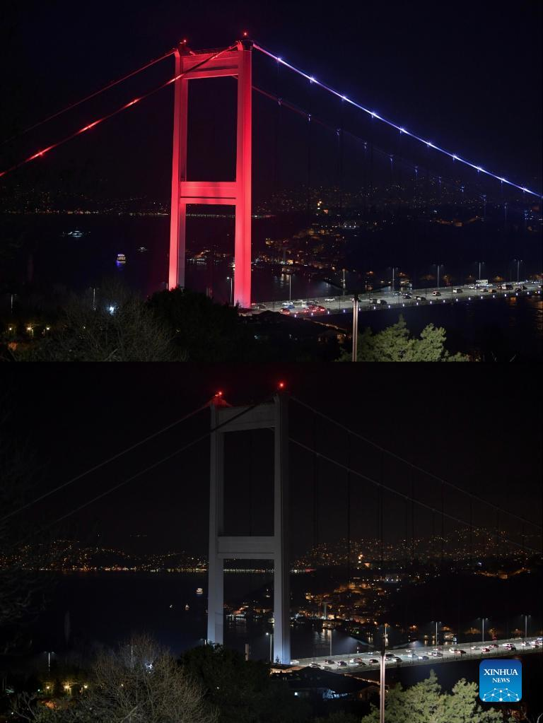 Combo photo shows a bridge over the Bosphorus Strait before (top) and during Earth Hour in Istanbul, Turkey, on March 26, 2022. (Xinhua/Shadati)