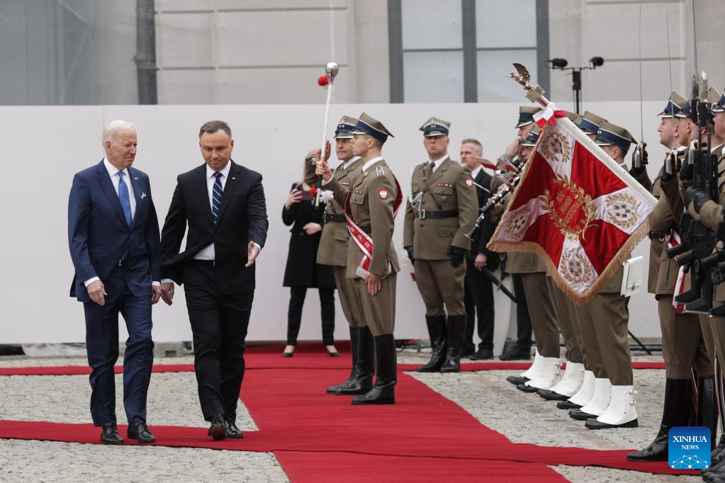 U.S. President Joe Biden (L, front) attends a welcome ceremony held by Polish President Andrzej Duda (R, front) in Warsaw, Poland, March 26, 2022. (Photo by Andrzej Hulimka/Xinhua)