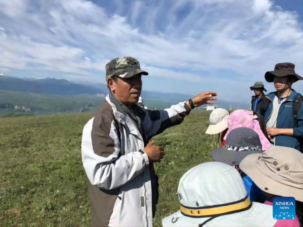 File photo taken on July 19, 2019 shows Hai Ying (1st L), a scientist, doing investigation on the plants of the Tianshan Mountains in northwest China's Xinjiang Uygur Autonomous Region.
