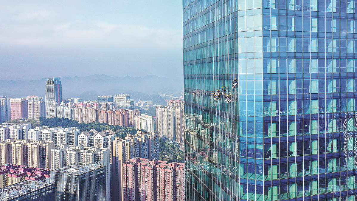 Skyscraper window cleaners clean the exterior of the Guiyang International Trade Center in Guiyang, Guizhou province, on March 15. China will adopt city-specific measures to facilitate sound development of the real estate sector. [Photo/Xinhua]