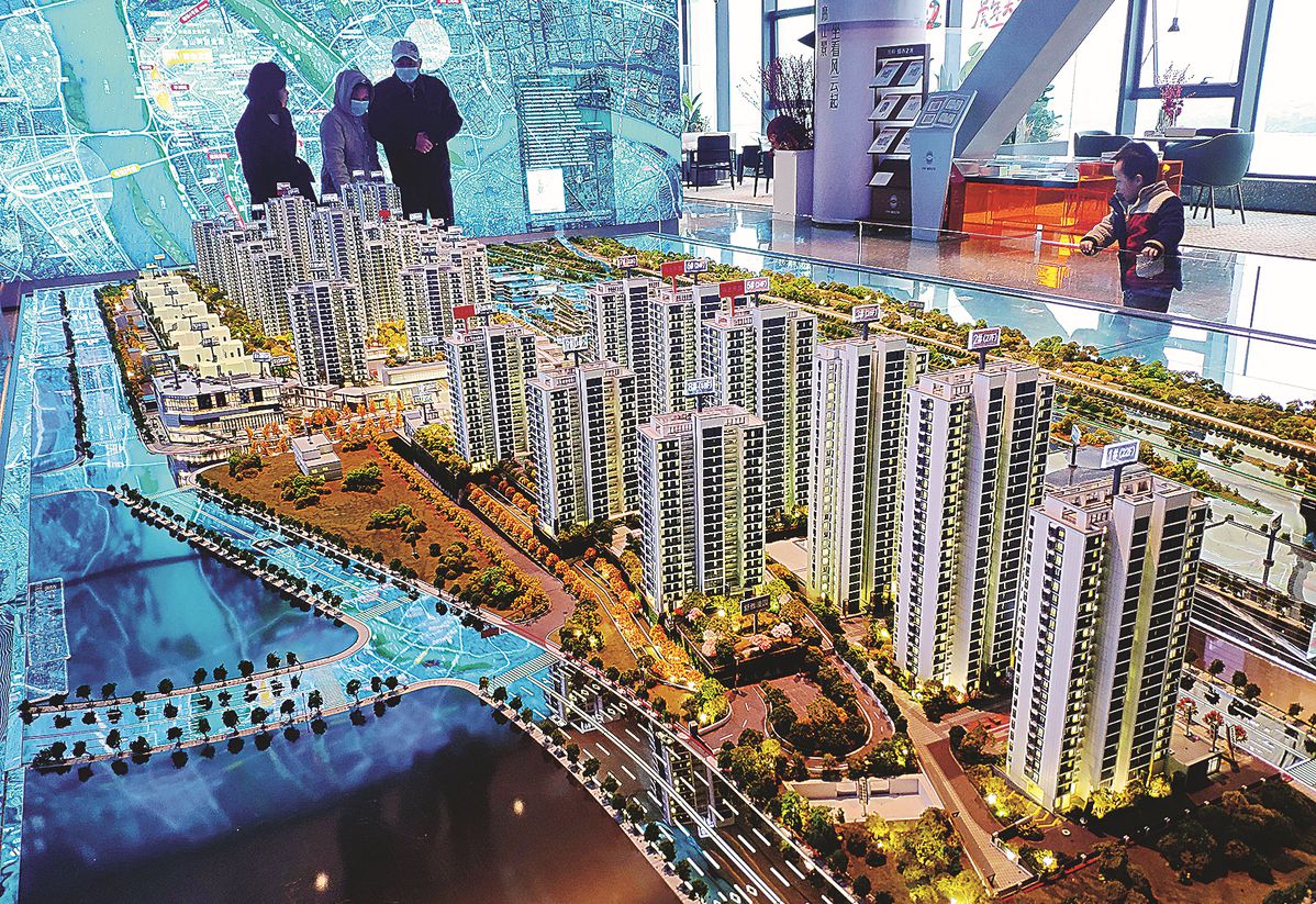 Potential homebuyers look at a model of a housing project in Fuzhou, Fujian province. China will keep land costs, housing prices and market expectations stable. [Photo/China News Service]
