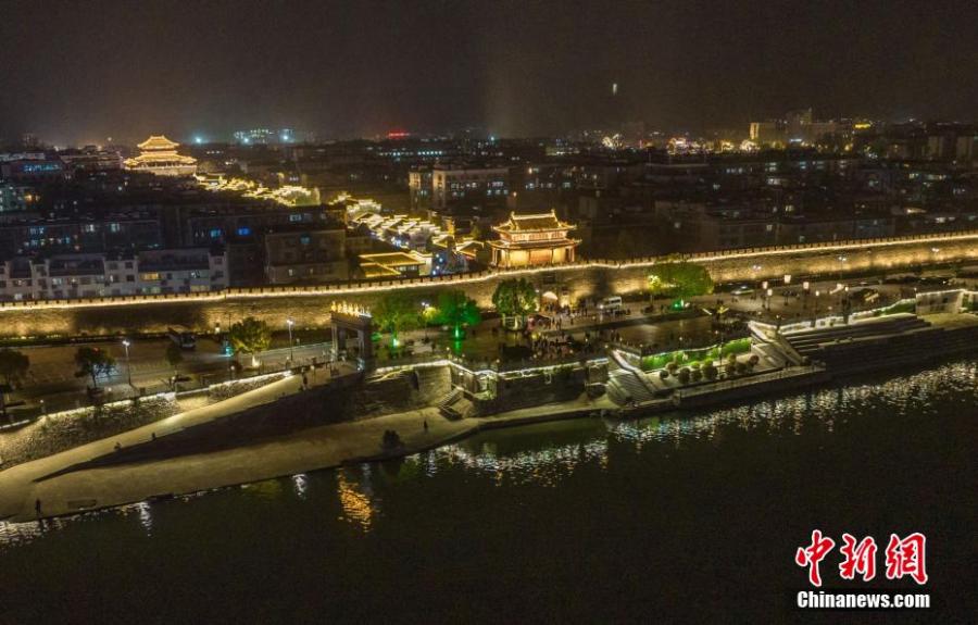 Aerial photo shows the view of illuminated downtown Xiangyang, central China's Hubei Province, March 27, 2022. Xiangyang is an ancient city with a history of more than 2,800 years and was first built in the Han Dynasty (206BC-220AD). (Photo: China News Service/Yang Dong)