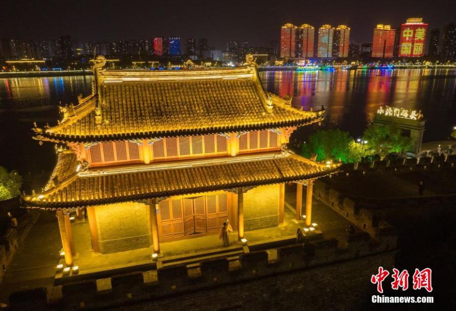 Aerial photo shows the view of illuminated downtown Xiangyang, central China's Hubei Province, March 27, 2022. Xiangyang is an ancient city with a history of more than 2,800 years and was first built in the Han Dynasty (206BC-220AD). (Photo: China News Service/Yang Dong)
