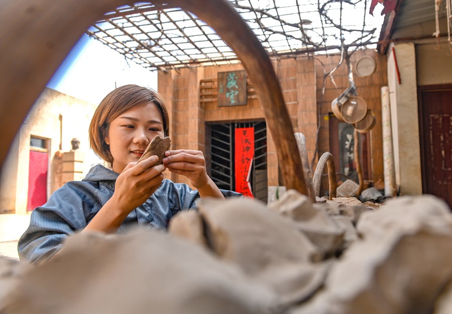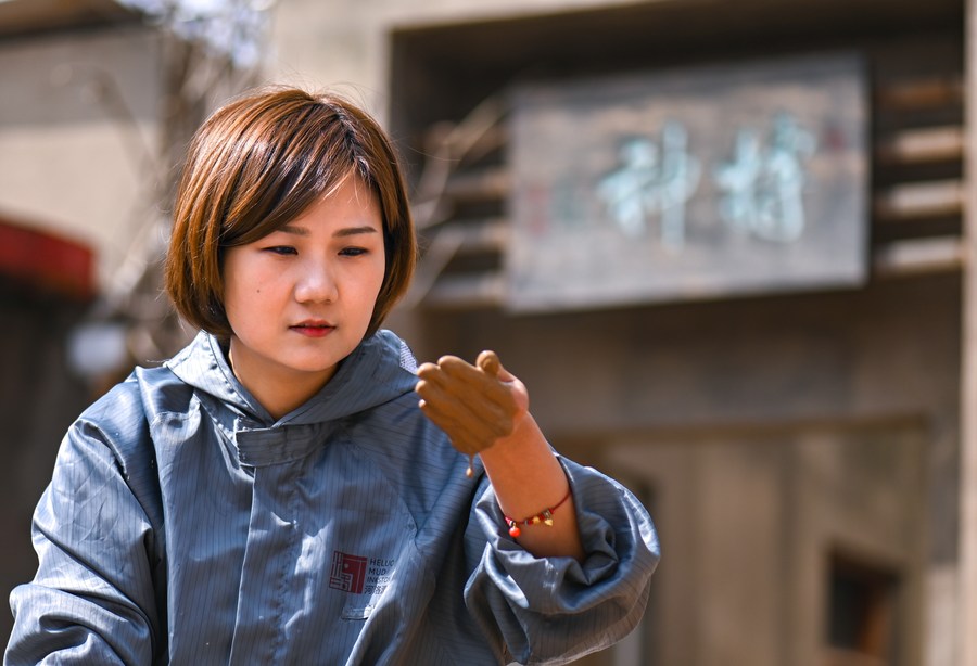 You Xiaoxiao prepares the mud to make the Yellow River Chengni inkstone in Xin'an County of Luoyang City, central China's Henan Province, March 24, 2022.