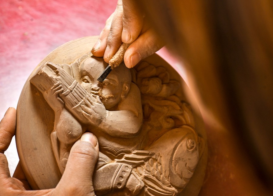LUOYANG, March 27 (Xinhua) -- The Yellow River Chengni inkstone has a history of over a thousand years. Craftsmen use washed Yellow River mud as raw materials, and process them following multiple steps including filtrating, molding, carving and firing. Each inkstone features unique glaze color due to various kiln temperatures during its firing process. The Yellow River Chengni inkstone was listed in the first batch of Henan provincial intangible cultural heritages in 2007.