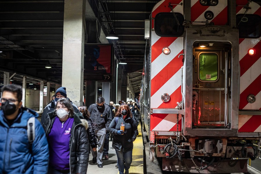 People wearing face masks get off a train at Union Station in Chicago, the United States, on Feb. 28, 2022. (Photo by Vincent D. Johnson/Xinhua)