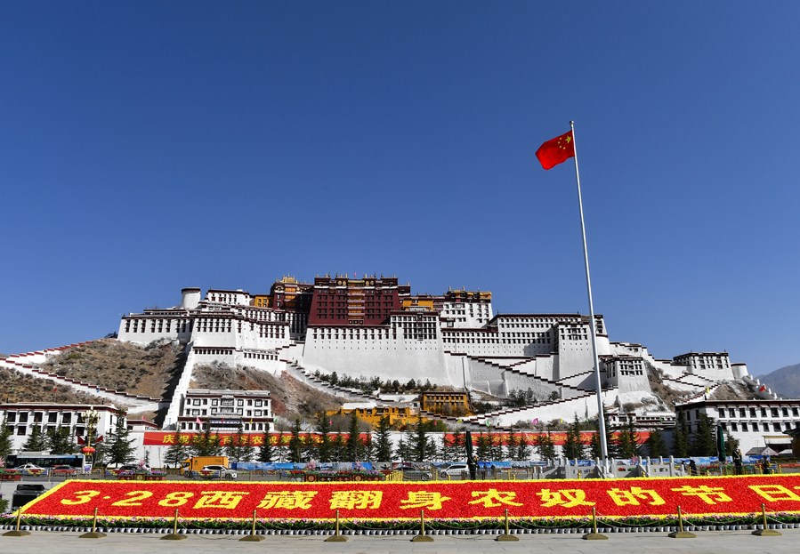 A flag-raising ceremony is held to celebrate the Serfs' Emancipation Day at the square in front of the Potala Palace in Lhasa, capital of southwest China's Tibet Autonomous Region, March 28, 2022. (Xinhua/Jigme Dorje)