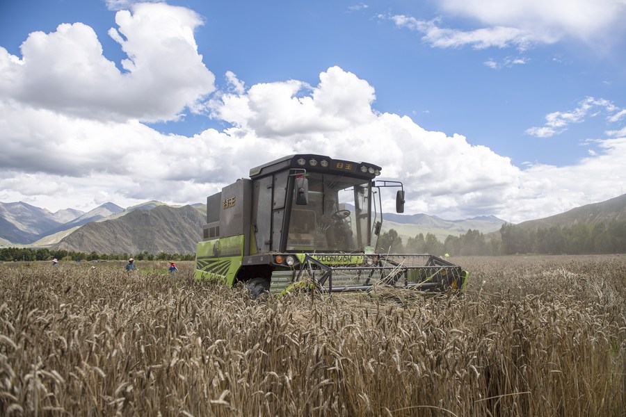 A farmer operates a harvester to reap highland barley at Kere Village of Dagze District in Lhasa, capital of southwest China's Tibet Autonomous Region, Sept. 6, 2021. (Xinhua/Sun Ruibo)