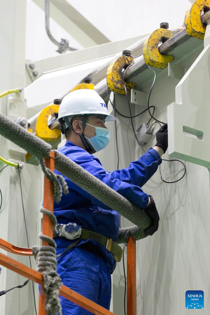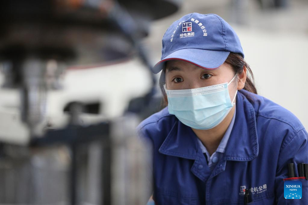 A staff member works at a workshop of Harbin Turbine Company Limited in Harbin, northeast China's Heilongjiang Province, March 28, 2022. China has implemented differentiated epidemic control measures in factories to keep production stable in workshops of key enterprises and construction of major projects across the country.