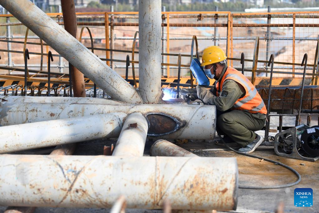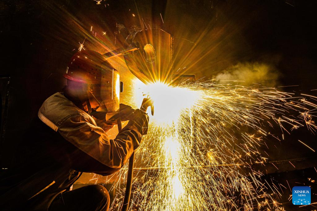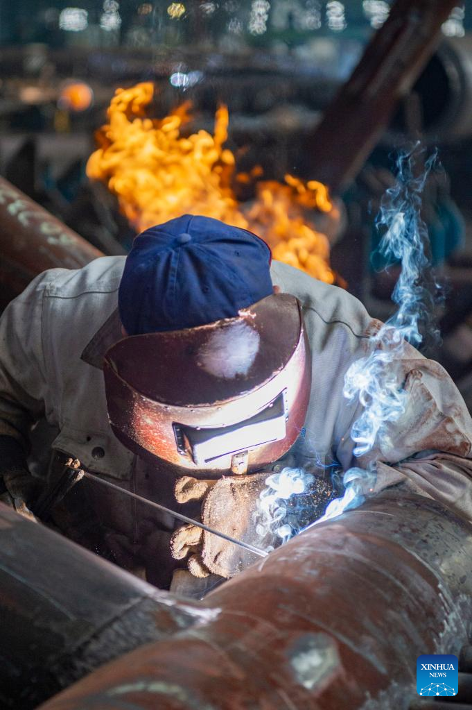 A worker welds at a workshop in Shenyang, capital of northeast China's Liaoning Province, March 24, 2022. China has implemented differentiated epidemic control measures in factories to keep production stable in workshops of key enterprises and construction of major projects across the country.