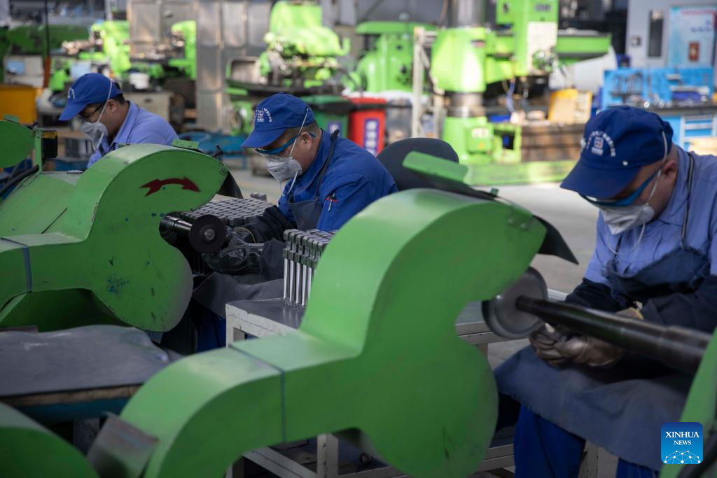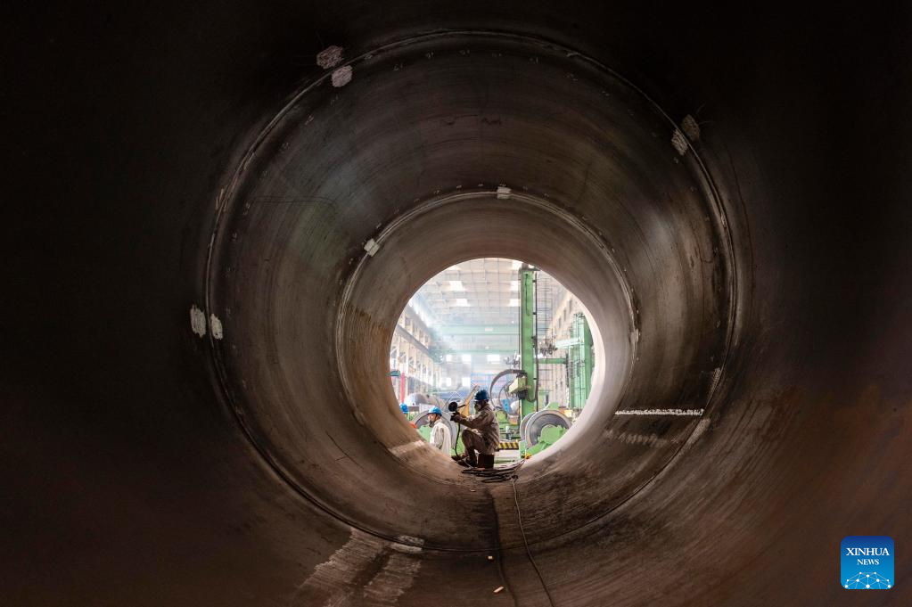 Staff members work at a workshop of Harbin Turbine Company Limited in Harbin, northeast China's Heilongjiang Province, March 28, 2022. China has implemented differentiated epidemic control measures in factories to keep production stable in workshops of key enterprises and construction of major projects across the country.