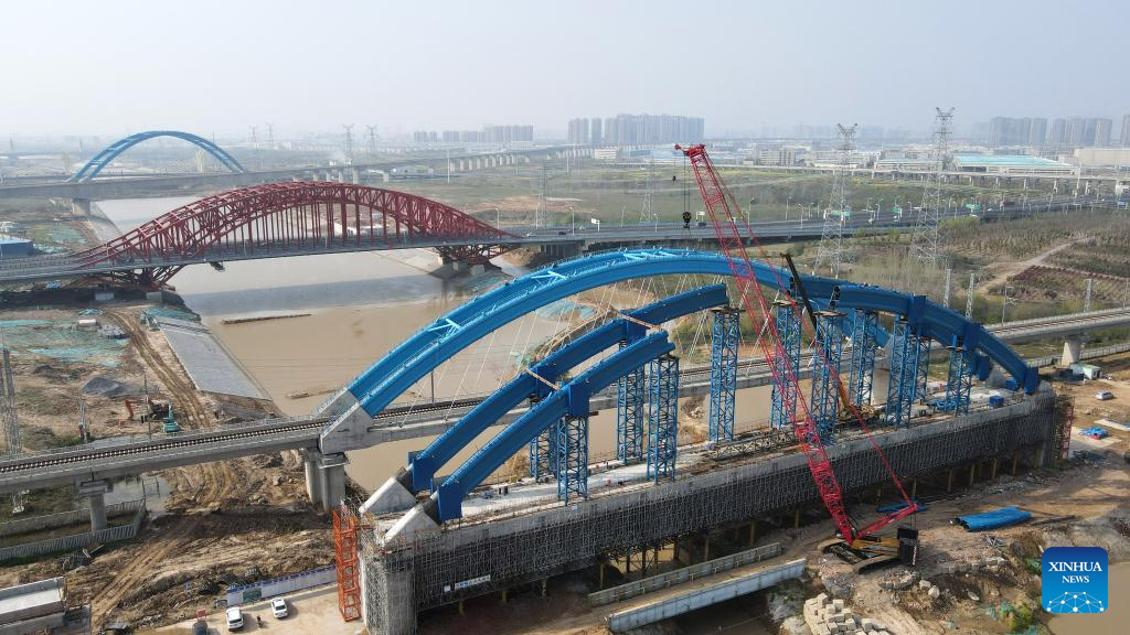 Aerial photo taken on March 28, 2022 shows the construction site of a railway rerouting, which is part of a key national project to divert water from the Yangtze River to the Huaihe River, in east China's Anhui Province. China has implemented differentiated epidemic control measures in factories to keep production stable in workshops of key enterprises and construction of major projects across the country.
