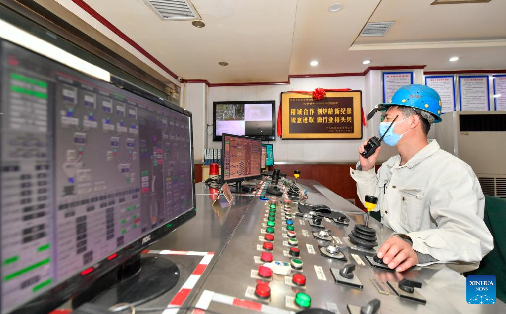 A staff member coordinates production in a special steel enterprise in north China's Tianjin, March 28, 2022. China has implemented differentiated epidemic control measures in factories to keep production stable in workshops of key enterprises and construction of major projects across the country.