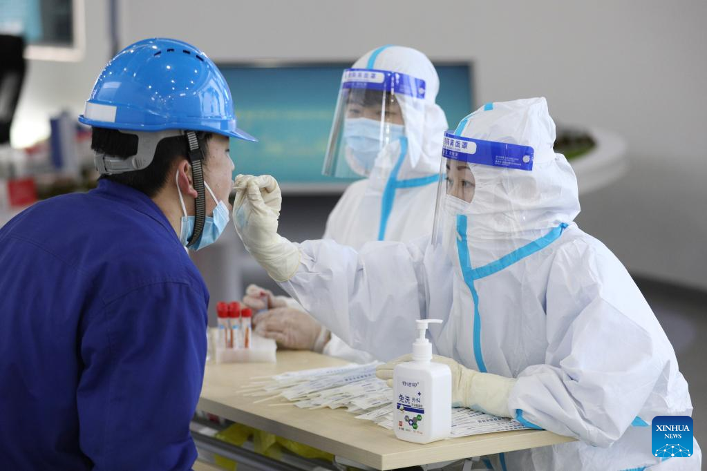 A medical worker collects a swab sample from a worker for nucleic acid tests at Harbin Turbine Company Limited in Harbin, northeast China's Heilongjiang Province, March 28, 2022. China has implemented differentiated epidemic control measures in factories to keep production stable in workshops of key enterprises and construction of major projects across the country.