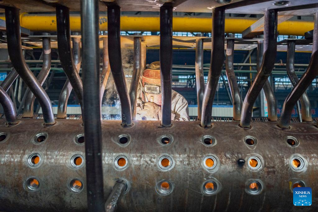 A staff member works at a workshop of Harbin Boiler Company Limited in Harbin, northeast China's Heilongjiang Province, March 28, 2022. China has implemented differentiated epidemic control measures in factories to keep production stable in workshops of key enterprises and construction of major projects across the country.
