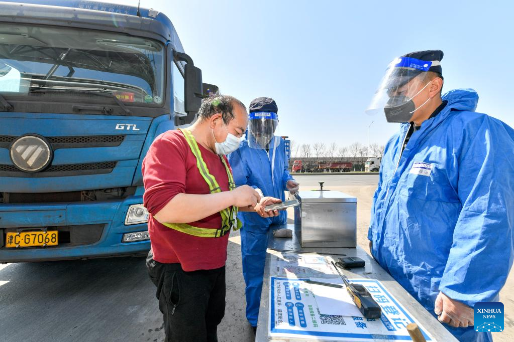 Staff members of a special steel enterprise check the health information of a man for entering the plant in north China's Tianjin, March 28, 2022. China has implemented differentiated epidemic control measures in factories to keep production stable in workshops of key enterprises and construction of major projects across the country.