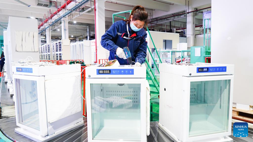 A staff member works at a workshop of Zhongke Meiling Cryogenics Co., Ltd in Hefei, east China's Anhui Province, March 28, 2022. China has implemented differentiated epidemic control measures in factories to keep production stable in workshops of key enterprises and construction of major projects across the country.