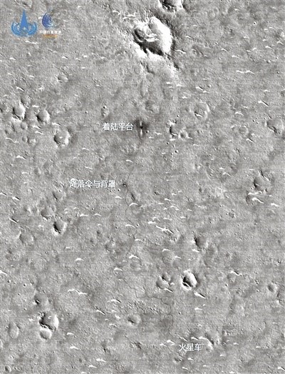 A new image of the inspection area of China’s Zhurong Mars rover with a resolution of 0.5 meters. The photo was taken by the orbiter of China’s Tianwen-1 Mars mission when it traveled past the area at the periareion, the point in the orbit that is closest to Mars. (Photo/China National Space Administration)