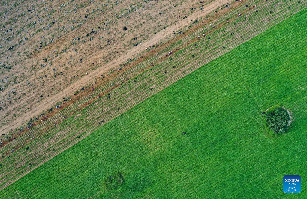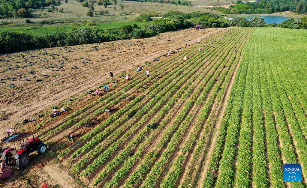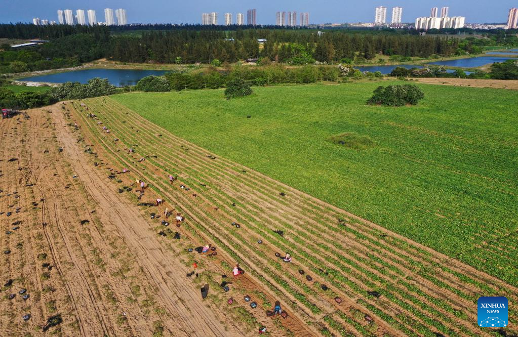 Workers harvest sweet potatoes in the fields of Wenchang City in south China's Hainan Provinceon March 26, 2022. The harvest season has started in Wenchang City in Hainan as farmers are busy picking and packing chestnuts, sweet potatoes, and pineapples. Fieldsacross the cityare already a hive of activity. (Xinhua/Guo Cheng)