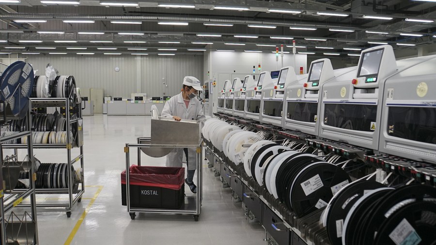 An employee works at an auto parts company in Anting Township of Jiading District, east China's Shanghai, March 26, 2022. Local enterprises have been maintaining stable production under strict COVID-19 prevention and control measures. (Xinhua/Wang Shujuan)