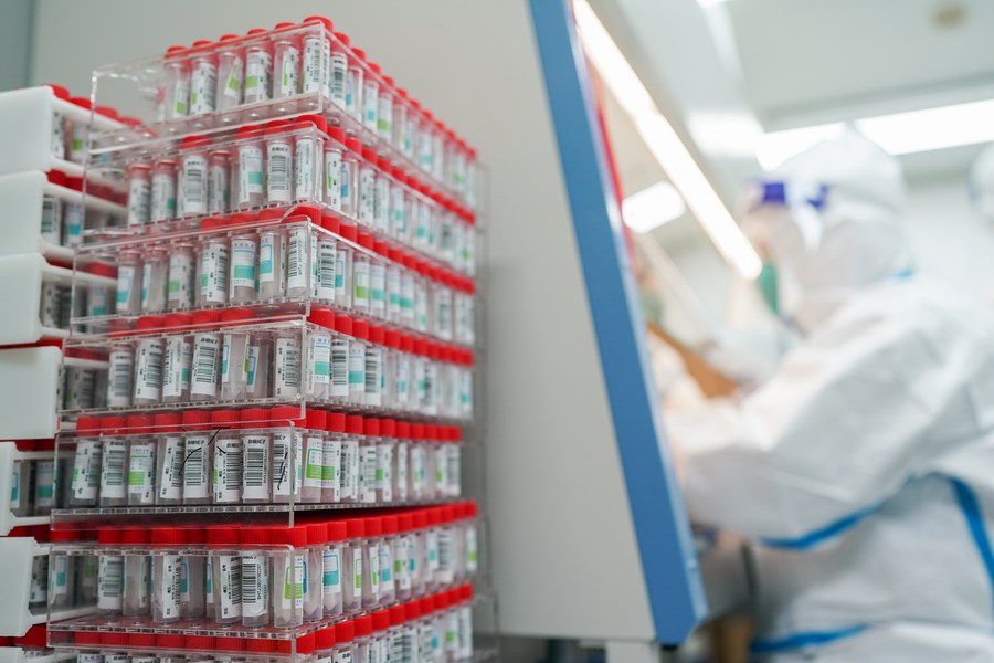 A staff member works at a COVID-19 nucleic acid testing laboratory in east China's Shanghai, March 23, 2022. (Xinhua/Ding Ting)