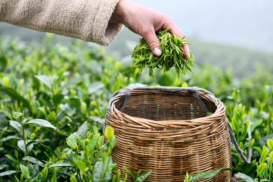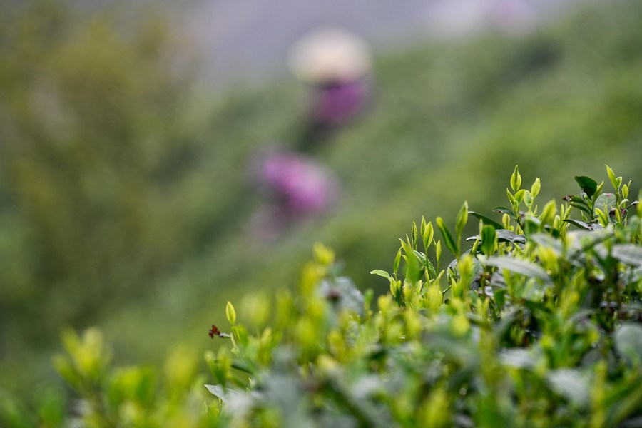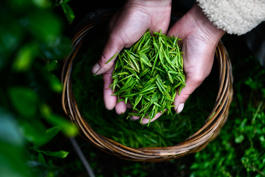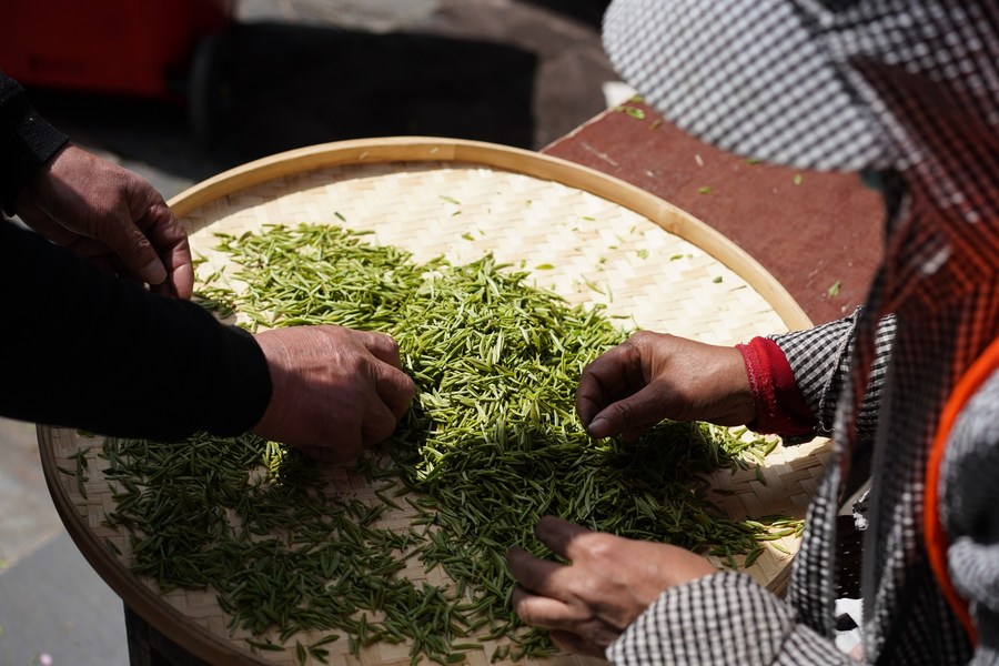 BEIJING, March 29, 2022 (Xinhua) -- Traditionally, Chinese value tea made from the very first tea sprouts in spring that should be picked up before Qingming Festival, which falls on April 5 this year. After a long winter's rest, the new shoots at this time are fine and tender with pleasant aroma, producing high-quality tea of the year.
