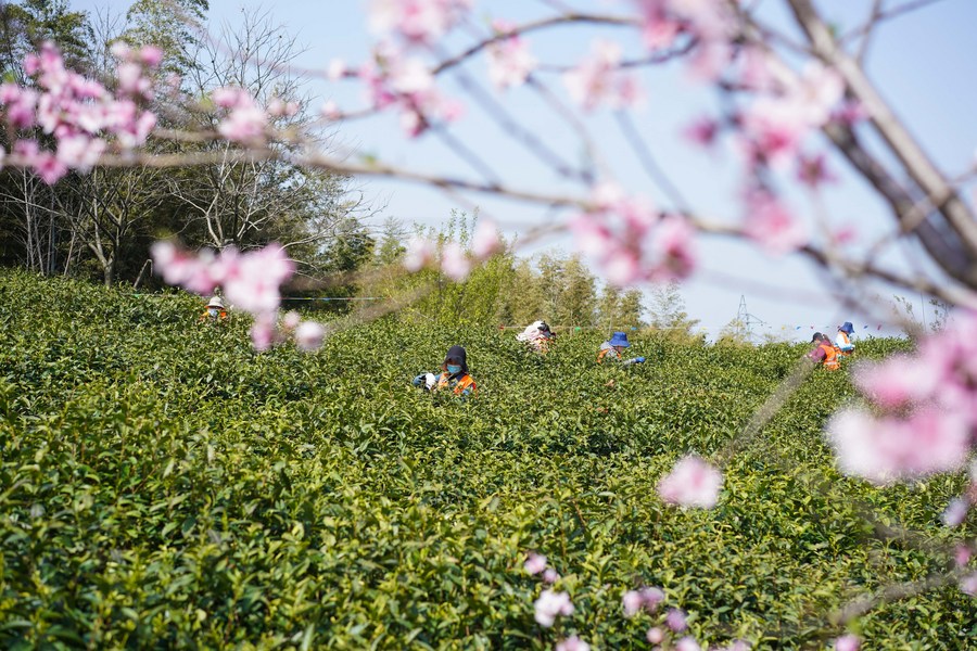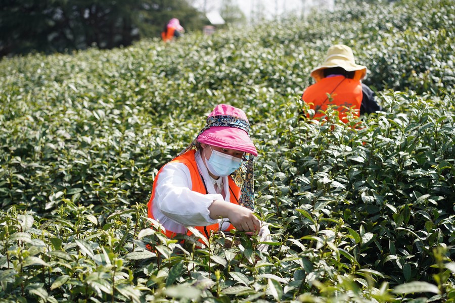 Workers pick tea leaves in a tea garden in Jiangning District of Nanjing, east China's Jiangsu Province, March 29, 2022. (Xinhua/Ji Chunpeng)