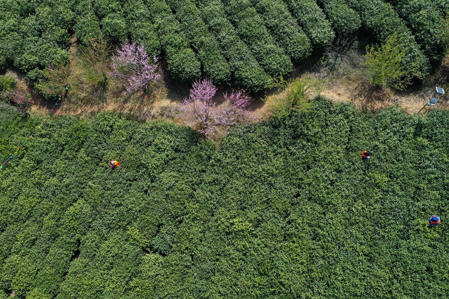 Aerial photo taken on March 29, 2022 shows workers picking tea leaves in a tea garden in Jiangning District of Nanjing, east China's Jiangsu Province. (Xinhua/Ji Chunpeng)