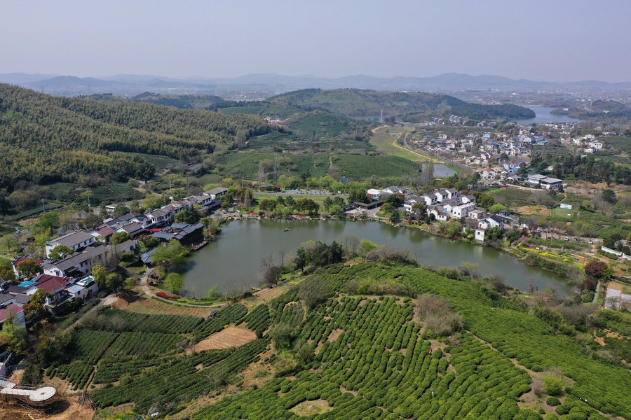 Aerial photo taken on March 29, 2022 shows a tea garden in Jiangning District of Nanjing, east China's Jiangsu Province. (Xinhua/Ji Chunpeng)