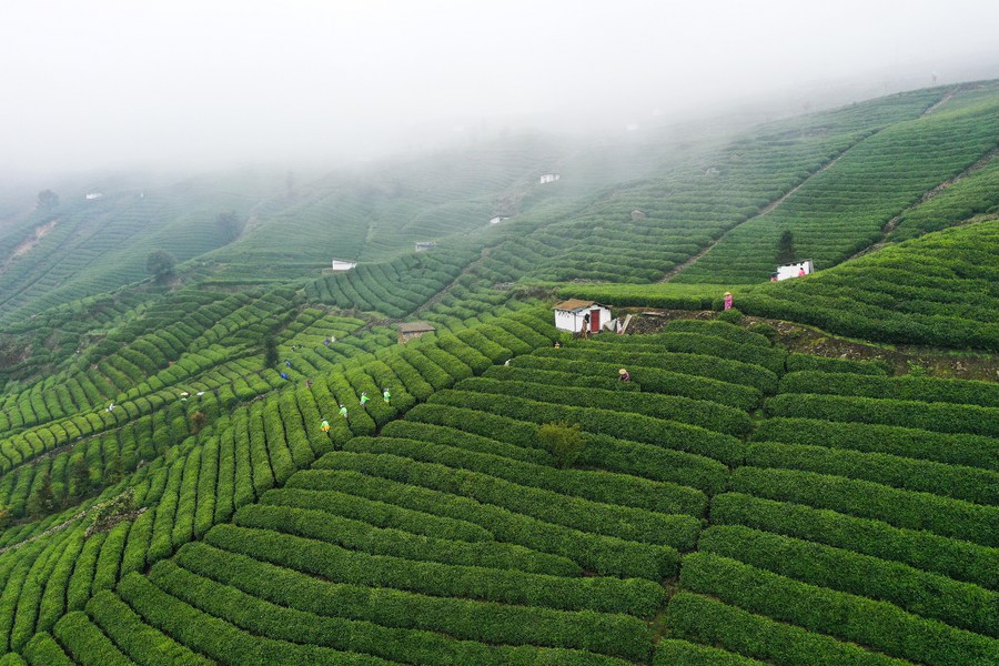 Aerial photo taken on March 29, 2022 shows villagers picking tea leaves in Niaowang Village of Yunwu Township in Guiding County, southwest China's Guizhou Province. (Xinhua/Yang Wenbin)