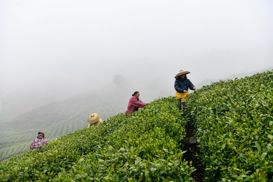 Villagers pick tea leaves in Niaowang Village of Yunwu Township in Guiding County, southwest China's Guizhou Province, March 29, 2022. (Xinhua/Yang Wenbin)