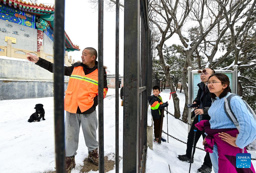 Song Chen (1st R) shows tourists the way in front of the watchtower on Mangshan Mountain in Beijing, capital of China, March 19, 2022.