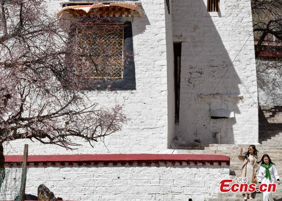 Picturesque scenery of peach blossoms beside the Phabongkha Monastery in northern suburbs of Lhasa, capital of southwest China's Tibet Autonomous Region, March 28, 2022. (Photo/China News Service)