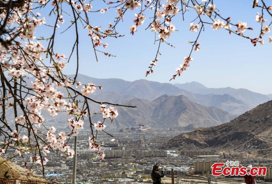 Photo shows the scenery of the Potala Palace seen far away from the Phabongkha Monastery in northern suburbs of Lhasa, capital of southwest China's Tibet Autonomous Region, March 28, 2022. Peach blossoms are seen beside the Phabongkha Monastery. (Photo/China News Service)