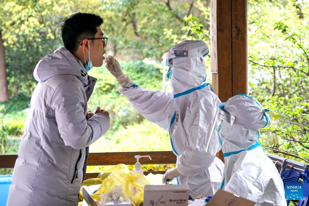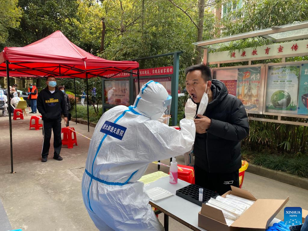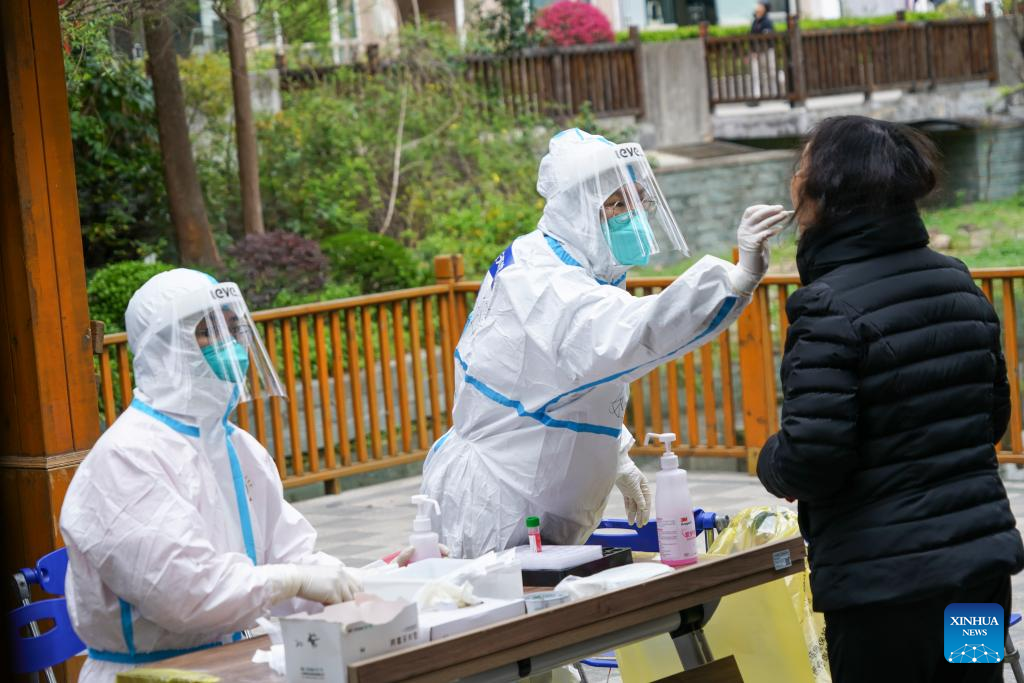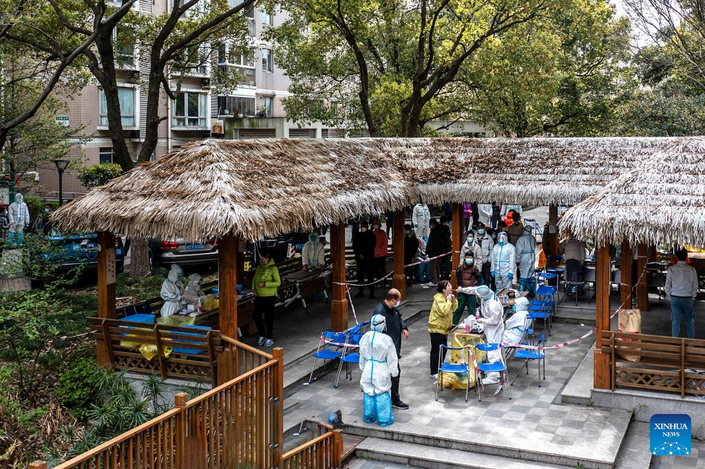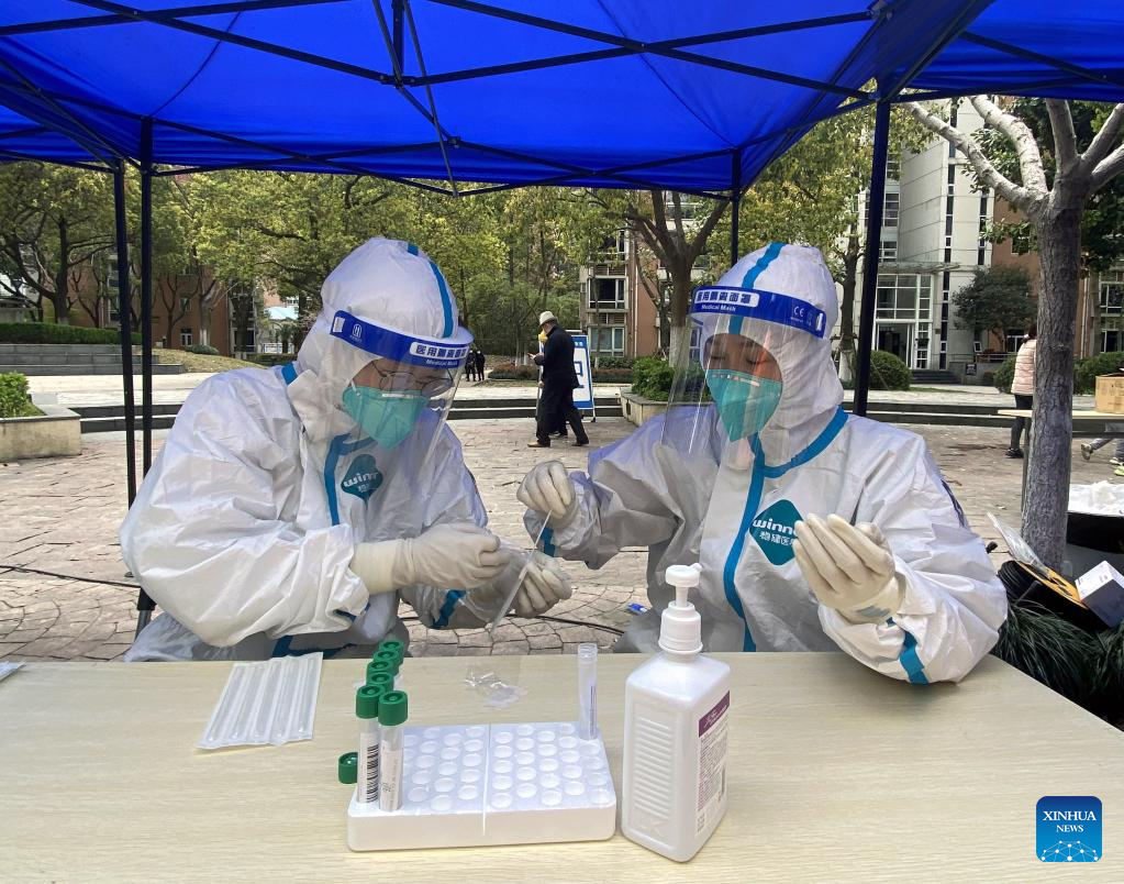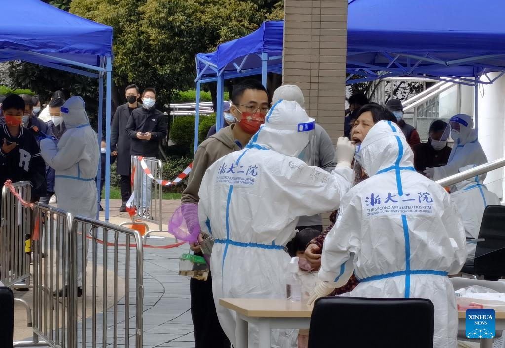 Medical workers from Zhejiang Province carry out nucleic acid tests for residents at a COVID-19 testing site in Pudong District of east China's Shanghai, March 28, 2022. A team of testing personnel from neighboring province of Zhejiang on Monday arrived in Shanghai to support a new round of nucleic acid testing in the city. (Photo by Jiang Aishan/Xinhua)