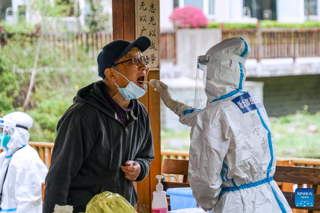 A medical worker from Zhejiang Province takes a swab sample from a resident for nucleic acid test at a COVID-19 testing site in Pudong District of east China's Shanghai, March 28, 2022. A team of testing personnel from neighboring province of Zhejiang on Monday arrived in Shanghai to support a new round of nucleic acid testing in the city. (Photo by He Zhongming/Xinhua)