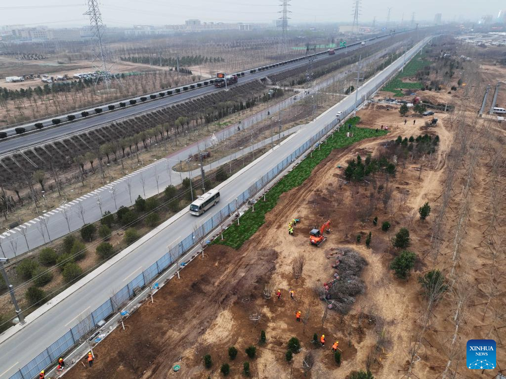 Aerial photo taken on March 29, 2022 shows the construction site of Minglangnan Street in Xiong'an New Area, north China's Hebei Province. The upgrading construction of Minglangnan Street is scheduled to complete in September. (Xinhua/Xing Guangli)
