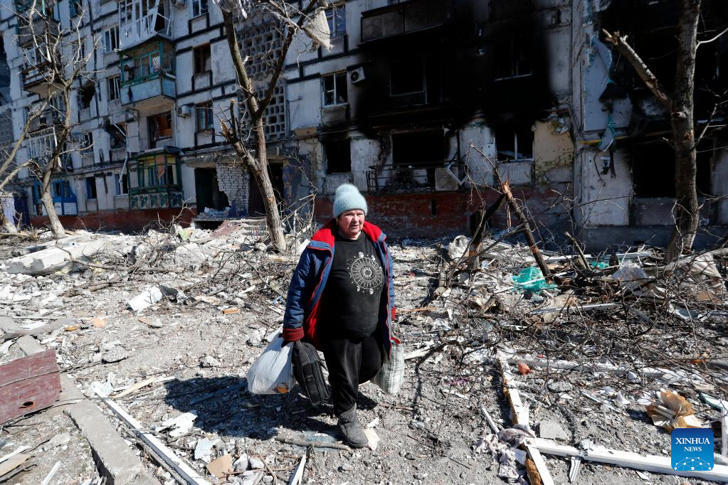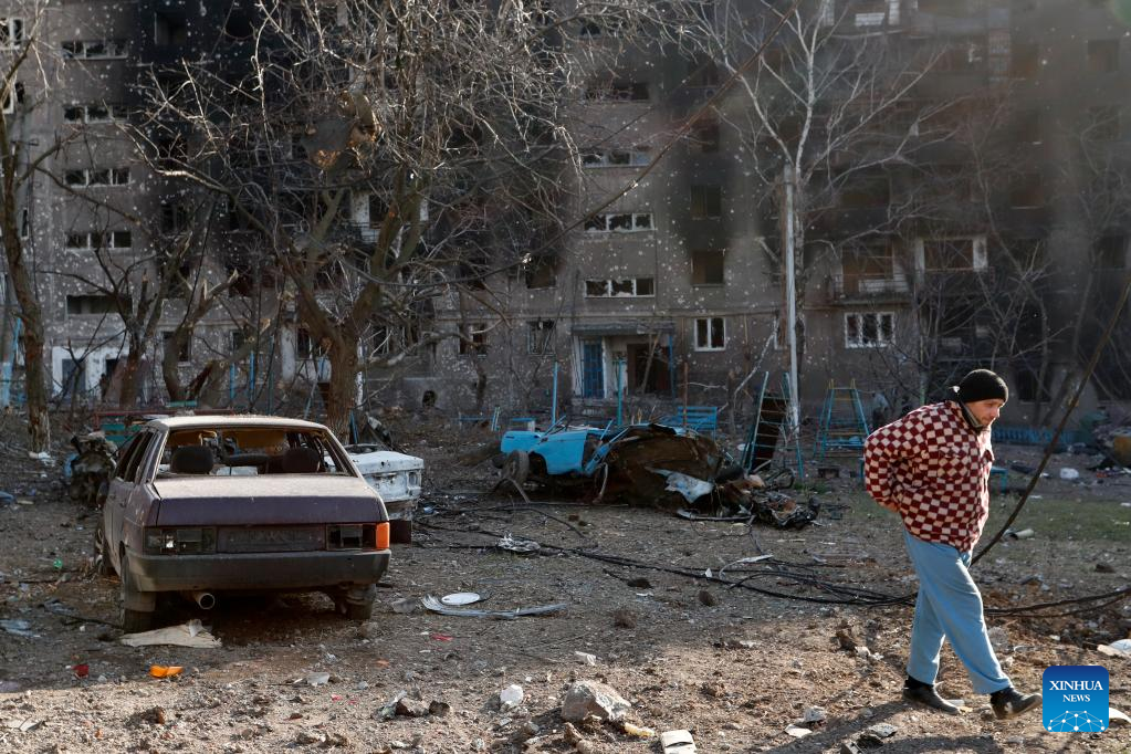 A resident walks past a damaged building in Mariupol, March 28, 2022. (Photo by Victor/Xinhua)
