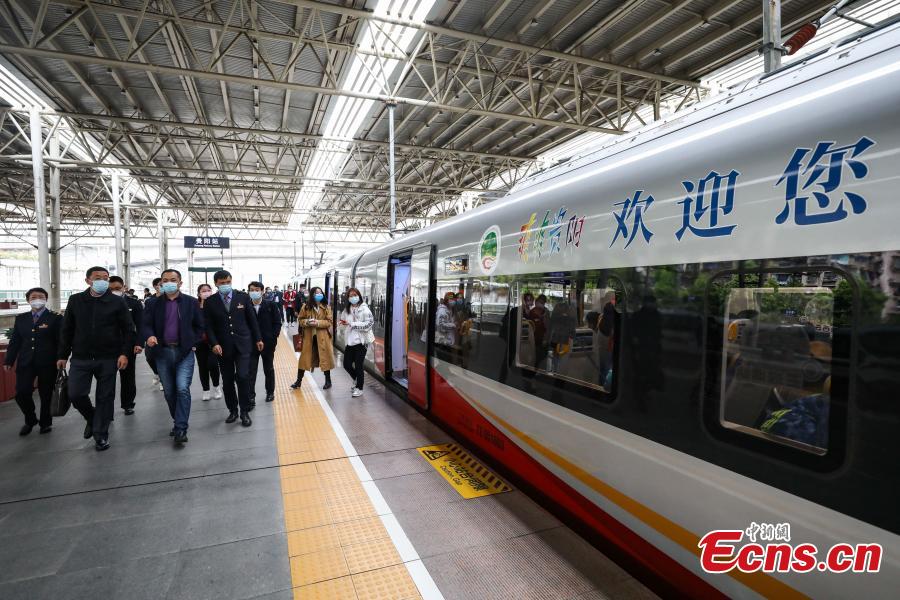 Passengers leave the platform after arriving at Guiyang railway station, March 30, 2022. (Photo: China New Service/Qu Honglun)