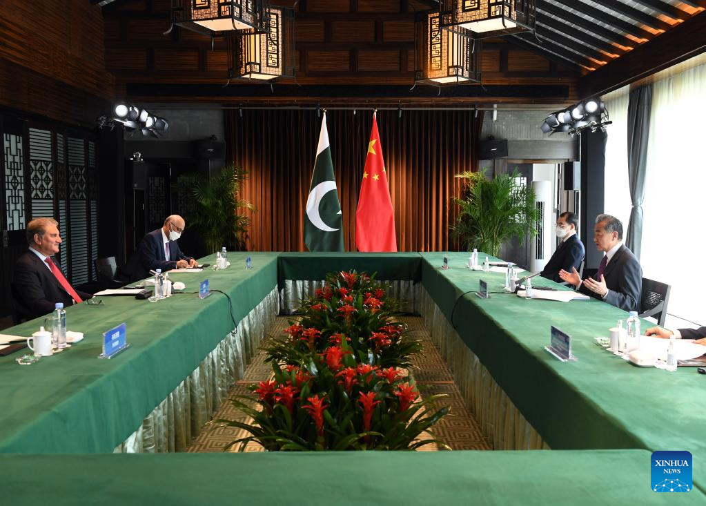 Chinese State Councilor and Foreign Minister Wang Yi holds talks with Pakistani Foreign Minister Shah Mehmood Qureshi in Tunxi, east China's Anhui Province, March 30, 2022. Qureshi is here to attend the third meeting of foreign ministers of the countries neighboring Afghanistan. (Xinhua/Zhou Mu)