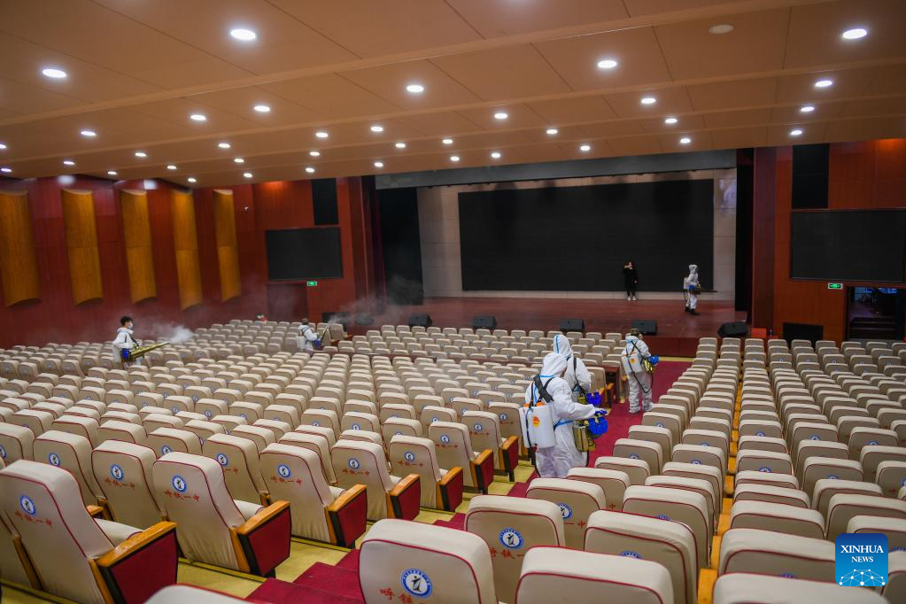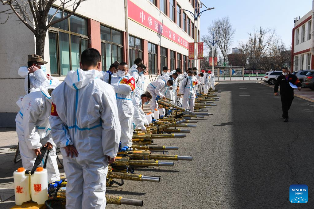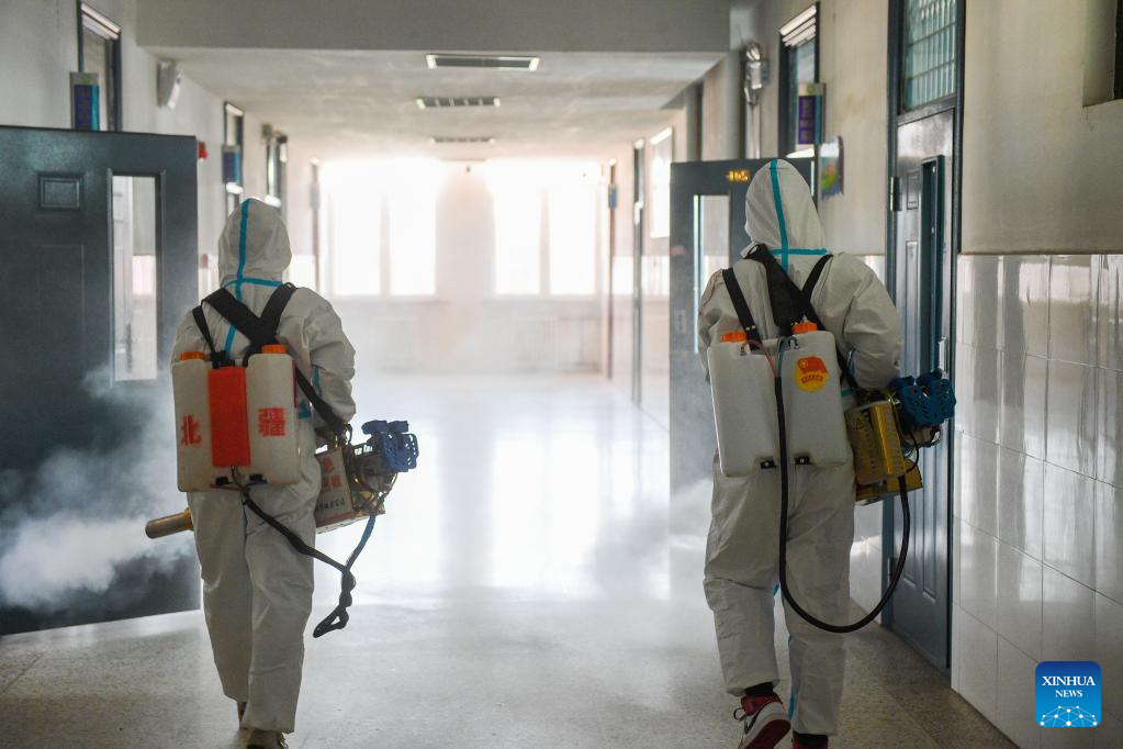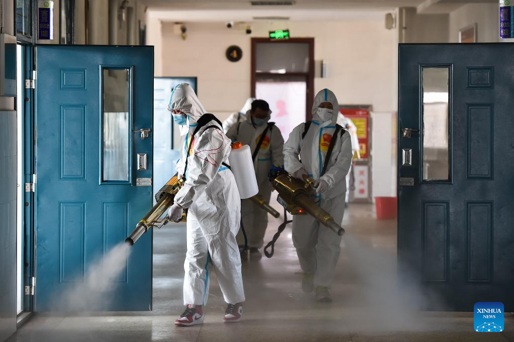Volunteers spray disinfectant at a school in Hohhot, north China's Inner Mongolia Autonomous Region, March 30, 2022.