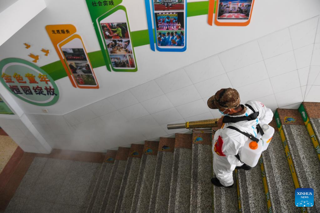 A volunteer sprays disinfectant at a school in Hohhot, north China's Inner Mongolia Autonomous Region, March 30, 2022.
