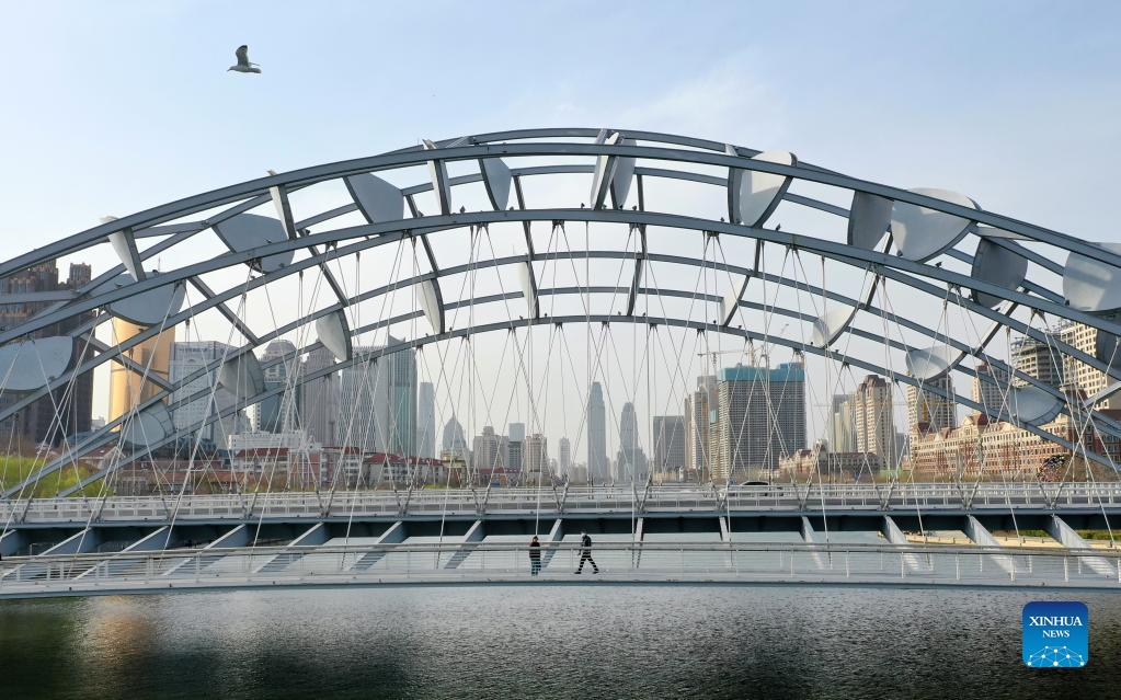 Aerial photo taken on March 27, 2022 shows the Chifeng bridge over the Haihe River in north China's Tianjin. (Xinhua/Sun Fanyue)