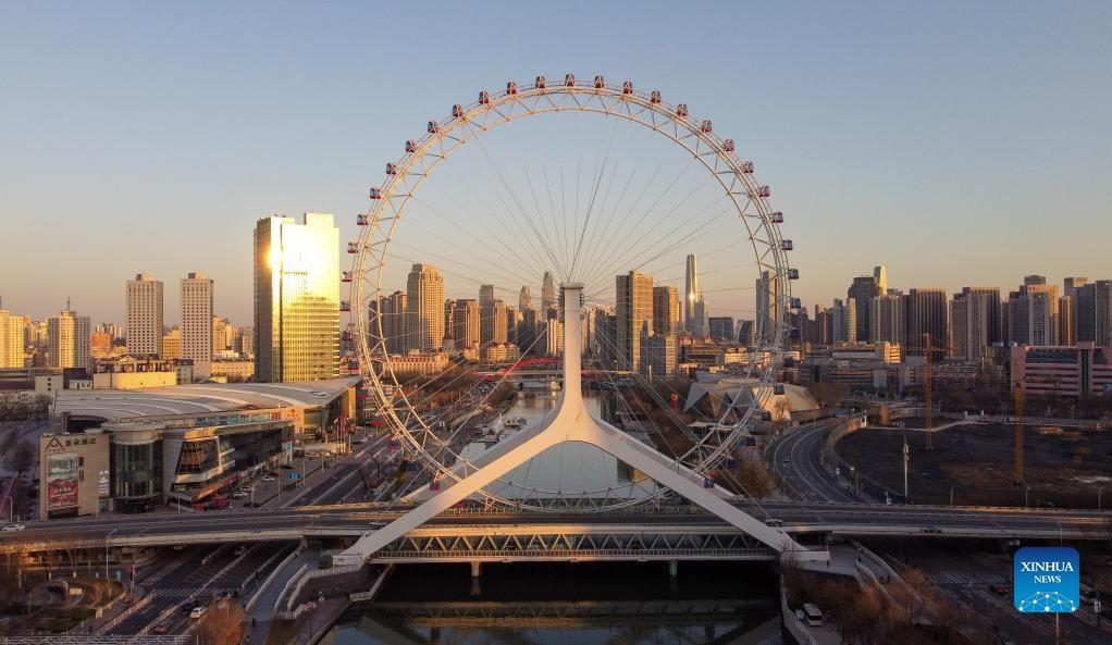 Aerial photo taken on March 27, 2022 shows a ferry wheel on Yongle bridge over the Haihe River in north China's Tianjin. (Xinhua/Sun Fanyue)